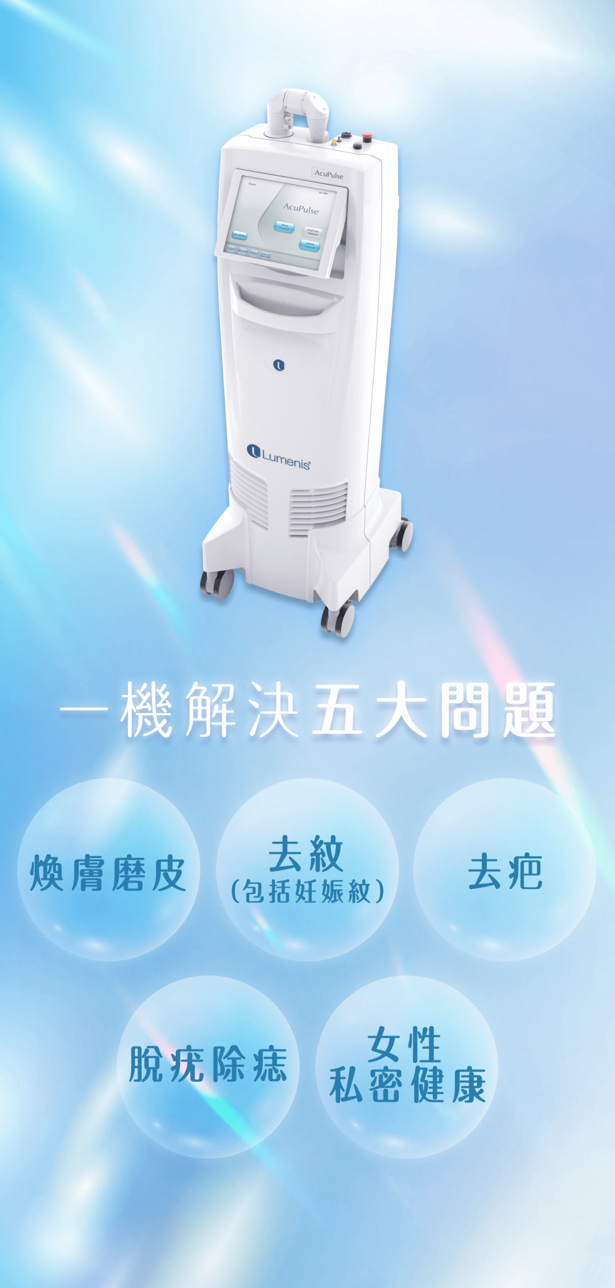AcuPulse™超脈衝激光療程採用CO2二氧化碳激光技術,一機多效處理陰道健康 、去疤、脫疣、去紋及煥膚五大問題。