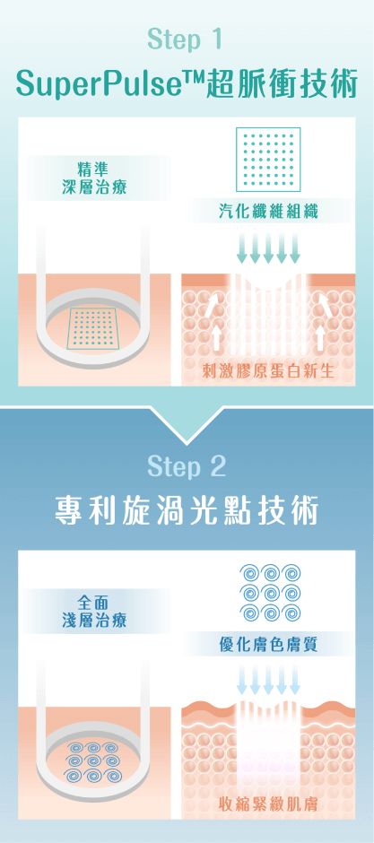 AcuPulse™️配搭獨特SuperPulse™️超脈衝輸出模式,以及專利旋渦光點技術,可以輸出細如髮絲的連續波微點光束,瞬間汽化皮膚組織,均勻修復肌膚,極快除疤脫疣,一次瞬間煥膚。