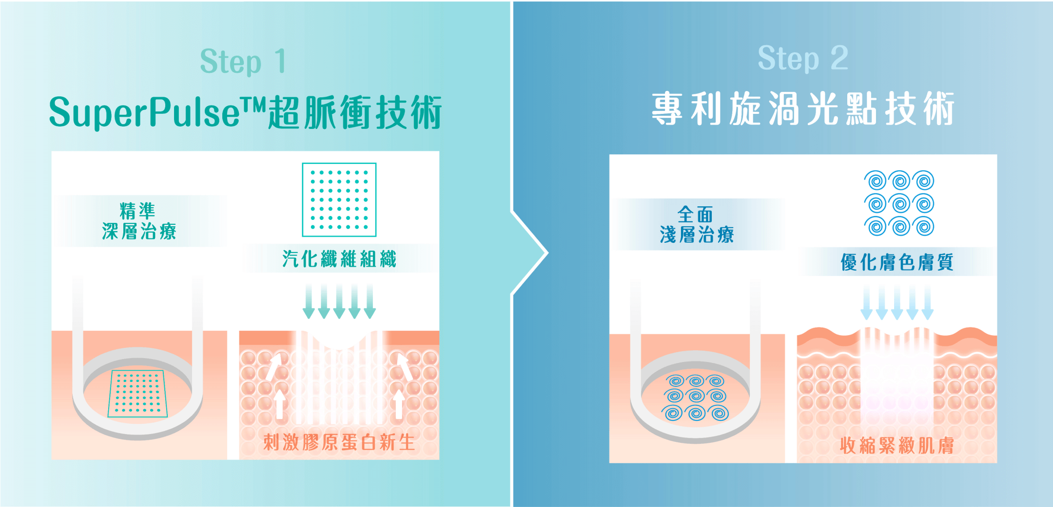 AcuPulse™透過10600nm三效波長,可針對表皮色素組織分區氣化,透過熱量在真皮層的累積,促使膠原蛋白產生收縮及增生,由深至淺達致煥膚、緊緻、新生三大作用。