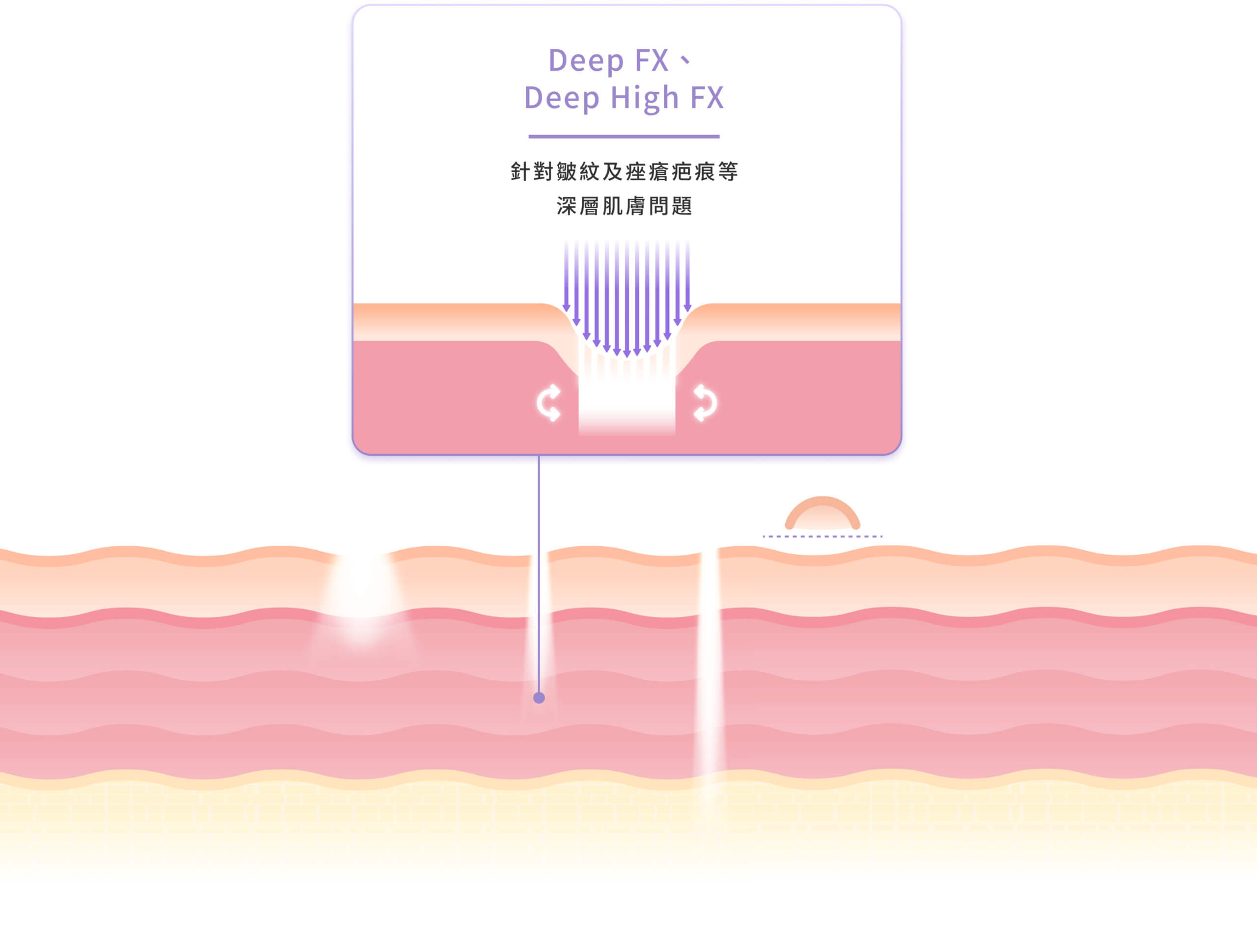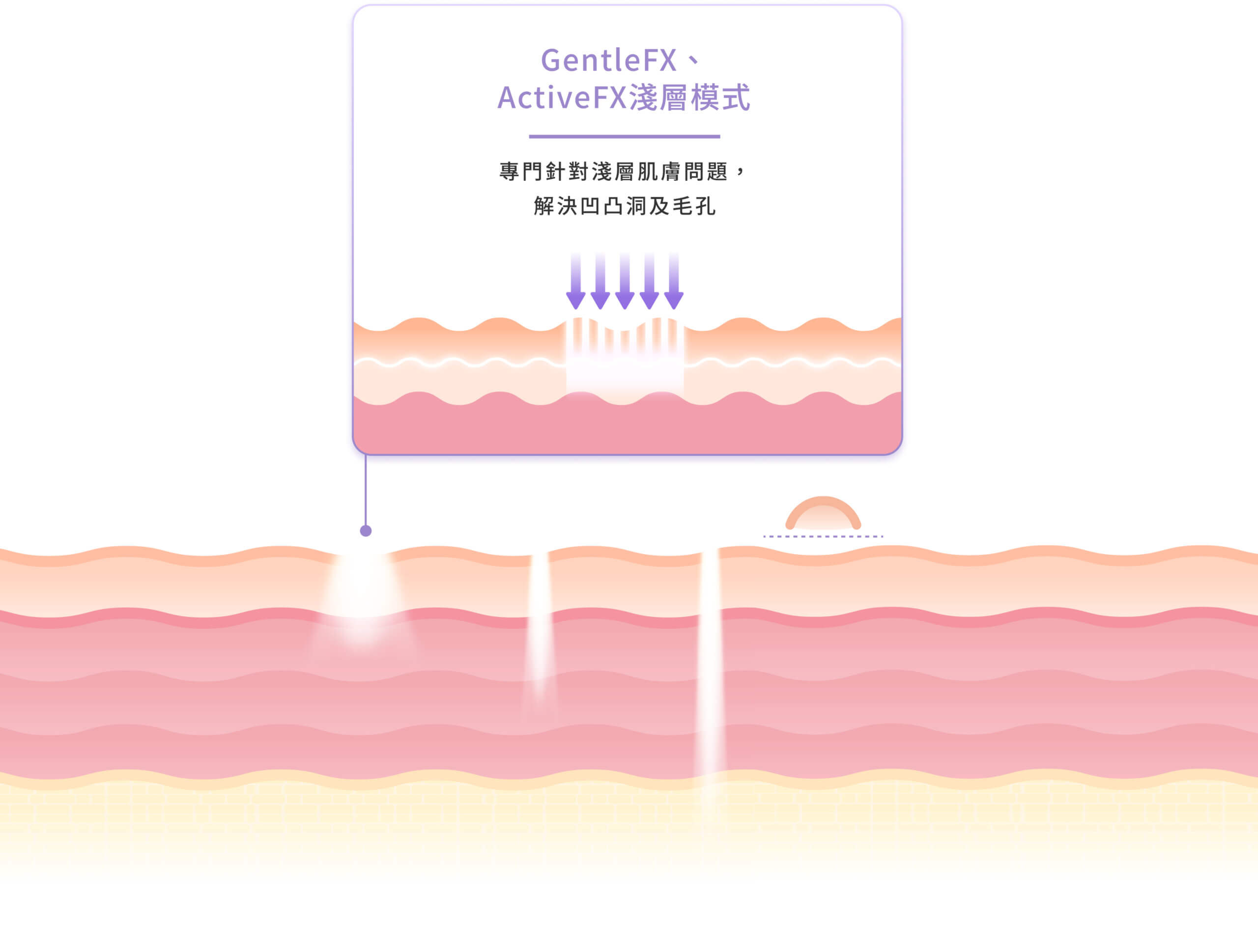 處理問題 極深層的肌膚問題 (例如粗大毛孔、皺紋、細紋、凹凸洞、嚴重疤痕、汗管瘤及痣疣) 較表面的肌膚問題 (例如毛孔、細紋、輕微痘印) 較深層的肌膚問題 (例如毛孔、細紋、色斑、輕微疤痕)