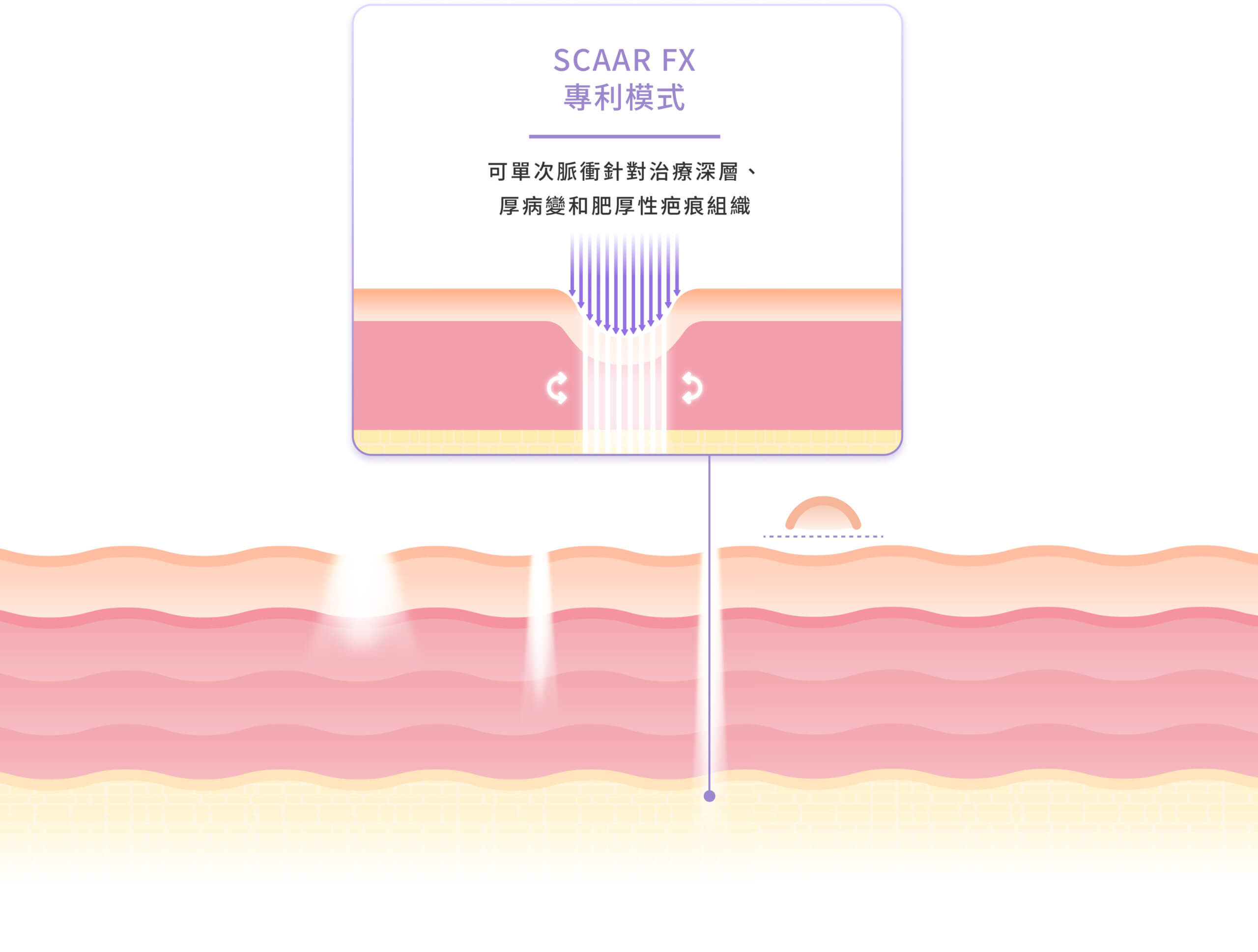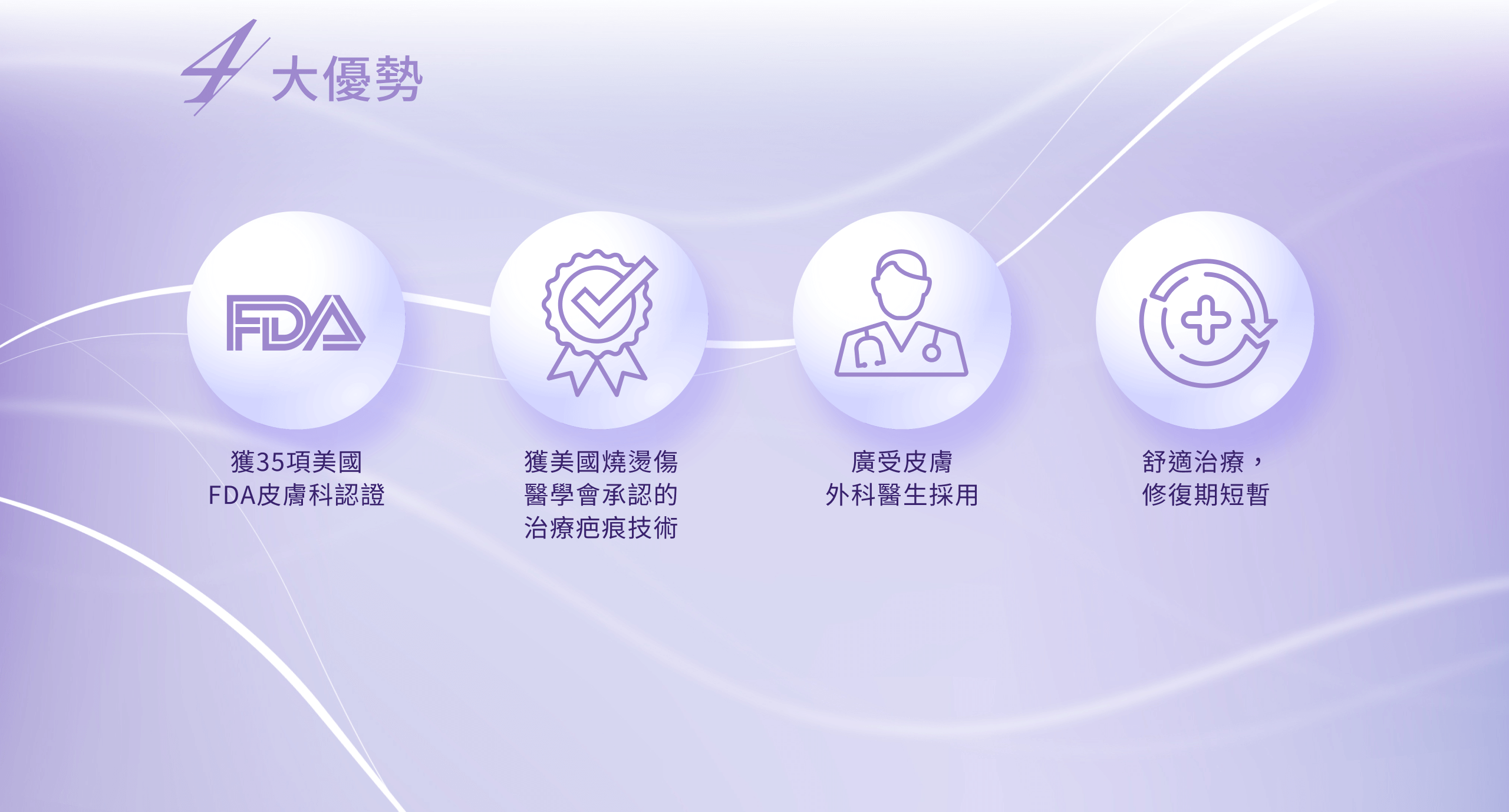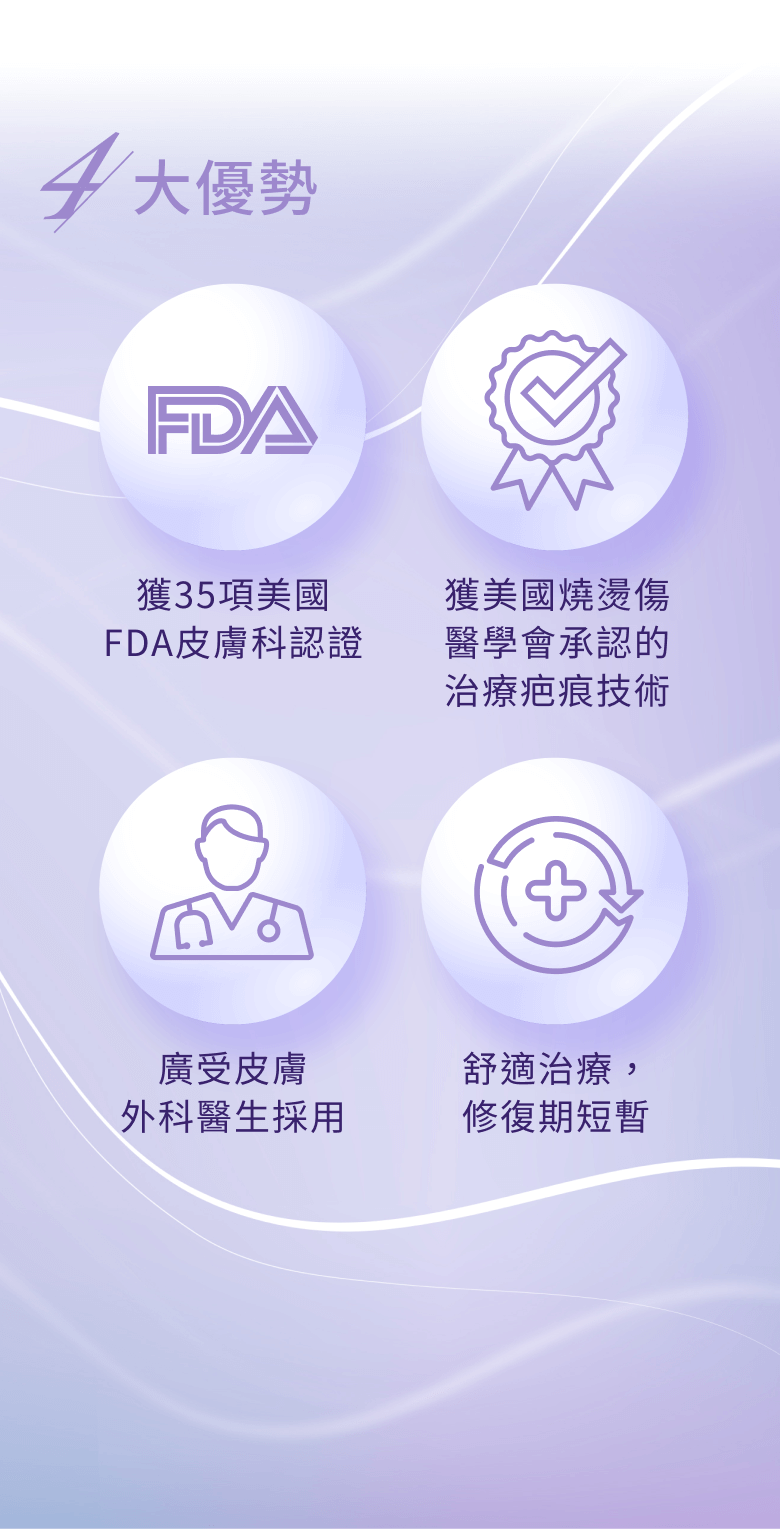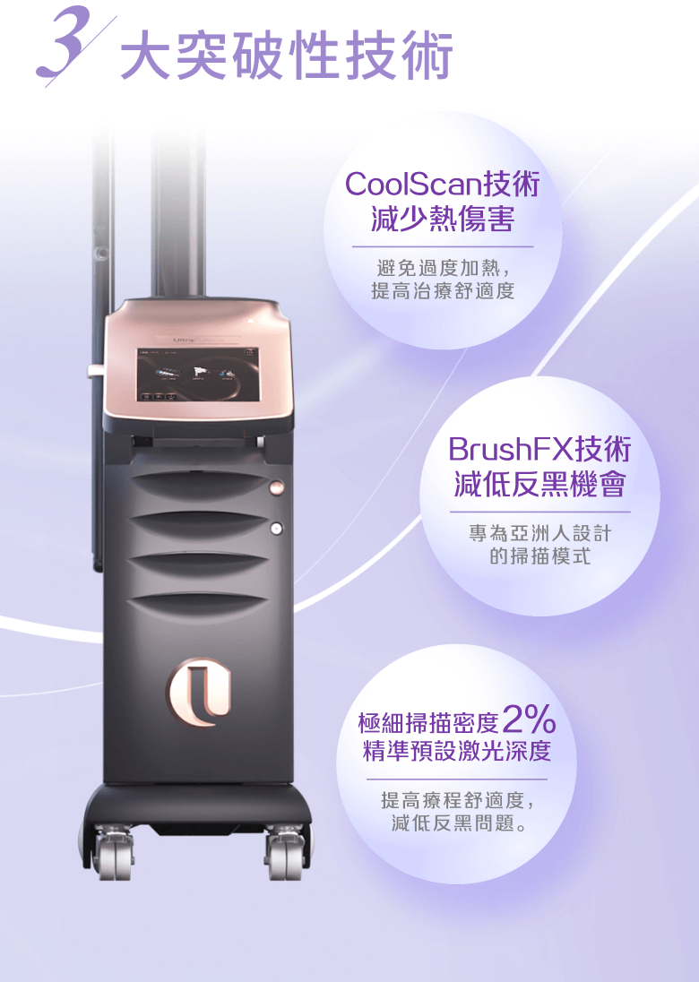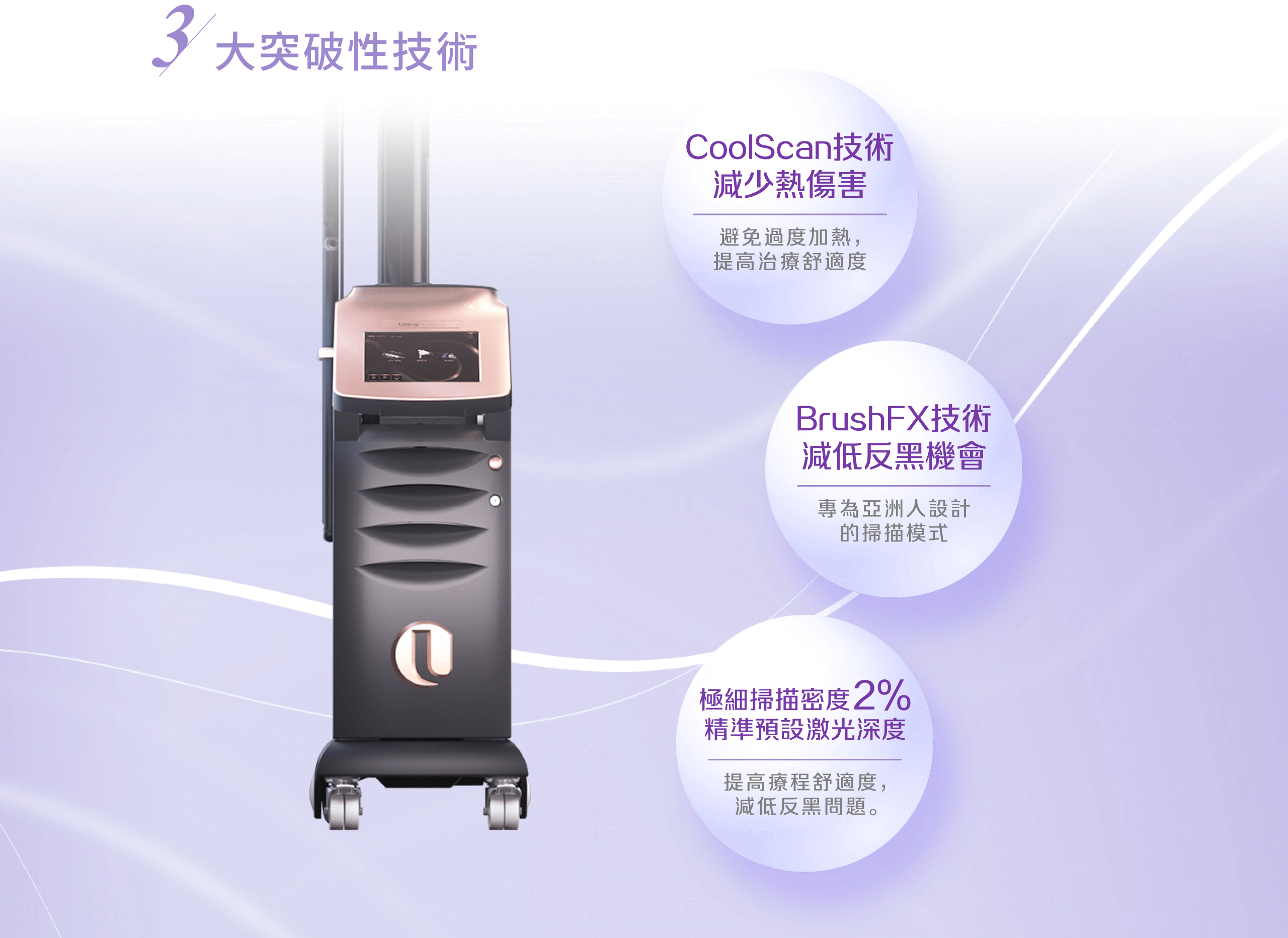 CO2點陣式激光治療深度強度較大, 極速脈衝技術比起舊式輸出的能量更準確穩定,調教至適合亞洲人皮膚的全新BrushFX模式,有效避免表皮燙傷及反黑機率,保證療程安全與舒適感。