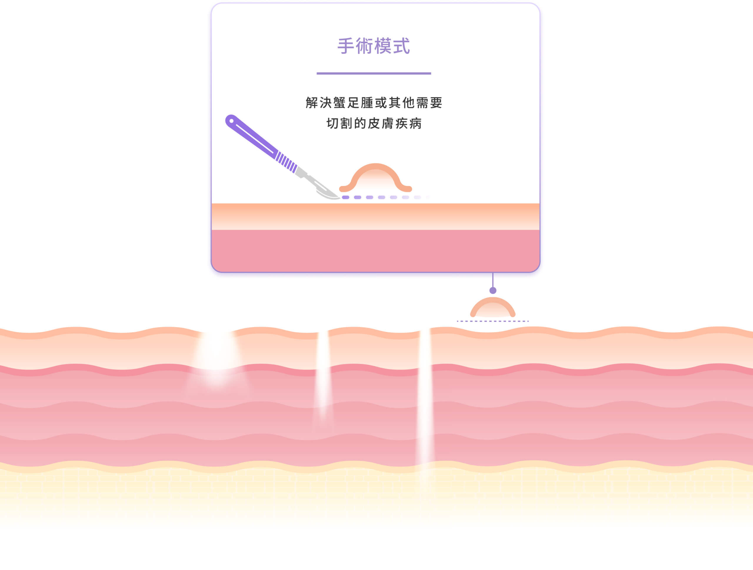 適用於需要在手術中對軟組織進行燒灼、汽化、切除、切割及凝血的醫療程序,其中包括醫學美容,例如:凹凸洞、痘疤、蟹足腫、手術疤痕、皺紋、細紋、疣、汗管瘤等適應症。